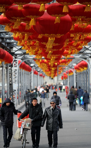 春节到临之际,黄河上的百年中山铁桥被数千只红灯笼粉饰一新(聂建江 摄)春节到临之际,